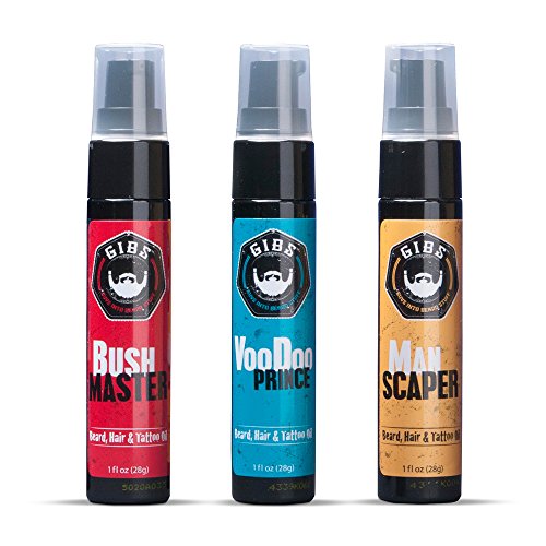 You will have beautiful paintings with GIBS Beard & Tattoo Oil 3 PACK - Manscaper, Bush Master, & Voo Doo Prince, Value Pack.GIBS Beard & Tattoo Oil 3 PACK - Manscaper, Bush Master, & Voo Doo Prince, Value Pack will help your job easier dexGIBS Best Beard Oil, 3 PACK! Voo Doo Prince - Manscaper - Bush Master GIBS Best Beard Oil, 1 oz. Voo Doo Prince Do that Voodoo that you do - Prince of Beards. Besides having the amazing healing properties of Argan, Olive and Sunflower Oils to nourish and strengthen your mane, this amazing oil has a spell binding fragrance with hints of Bergamot, sage and sandalwood. Copaiba Balsam helps prevent break-outs and Passionfruit Oil protects against beardruff. GIBS Best Beard Oil, 1 oz. Manscaper Groomed and pruned may not be your style but we know your look is definitely your own. Protect your beard and the baby face beneath with our amazing formula of Sunflower, Olive and Argan oils. They'll soften and manage your mane, while Passionfruit and Copbaiba Oils help prevent acne and other stuff from invading your brush. A manly scent with hints of nutmeg, leather, vanilla and musk will leave 'em wanting for more. GIBS Best Beard Oil, 1 oz. Bush Master Oh master of all you survey, you'll have to fend off the ladies once they're cheek to cheek with you. Rich moisturizing nutrients from Passionfruit and Argan oils soften your scruff while an adventurous fragrance of Grapefruit, Tobacco flower, saffron and cedar spice up your life. Copaiba Balsam helps prevent break-outs and beardruff while Sunflower and Olive Oils heal and condition. Directions: Apply a few drops to your hand. Rub on the entirety of your beard, coating from skin to end. Take one last look in the mirror and face the day like a man; beard first.